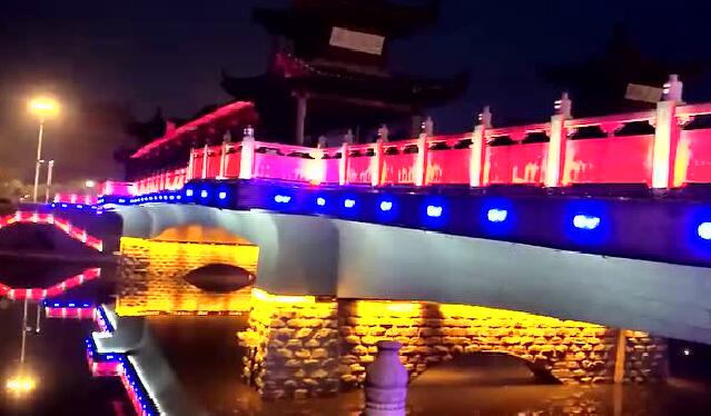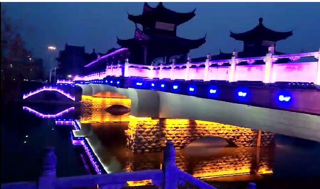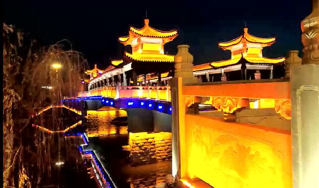 太平橋用隱藏式的瓦楞投光燈照亮建筑屋面,變幻四季顏色,絢麗多彩,形成一定的韻律感,河中倒影給人波光粼粼的勝境,整體氣勢恢弘,在橋的欄桿下一側(cè)用定制的祥云圖案燈順序排列,寓意祥和、太平,突出太平盛世文化。
